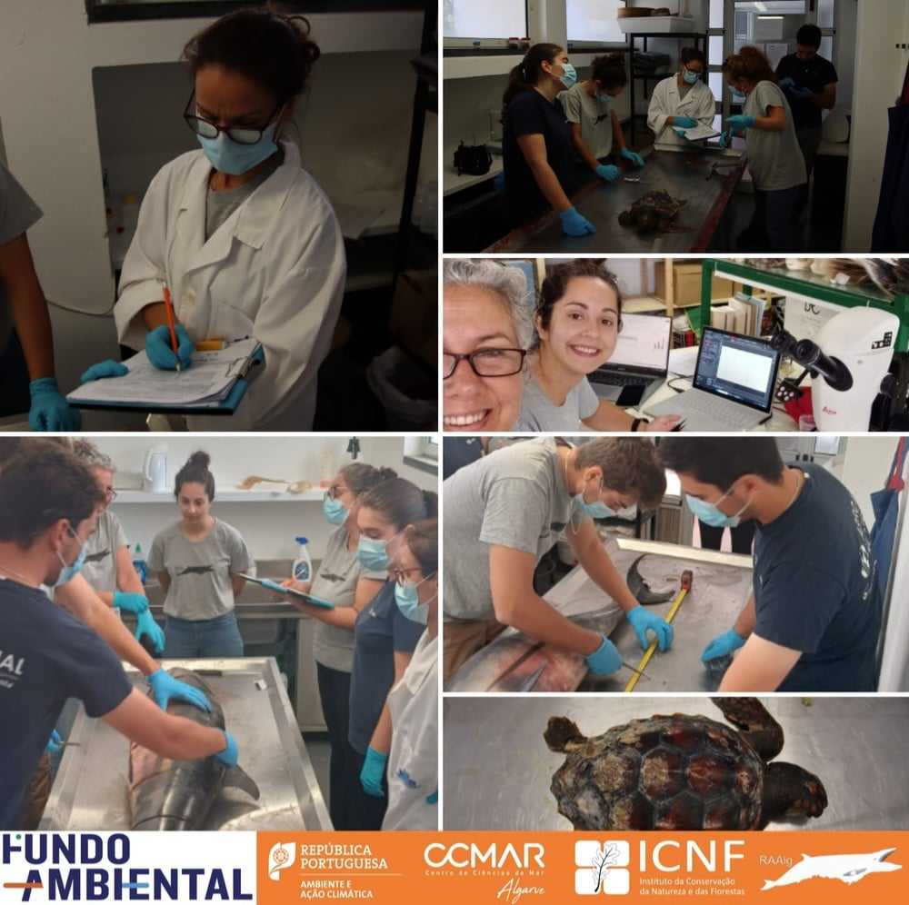 Um agradecimento especial à equipa da ARROJAL (Rede de Arrojamentos do Alentejo), por ter aceite o desafio extra e reunir esforços para se juntar a nós no dia seguinte, no qual foi dinamizado um workshop prático.O dia foi marcado pela realização das necrópsias de dois animais arrojados, um golfinho-riscado (Stenella coeruleoalba) e uma tartaruga-comum (Caretta caretta), reservados para o efeito. Estes encontros surgem com o intuito de partilhar conhecimento e experiências e são fundamentais para a uniformização de protocolos.